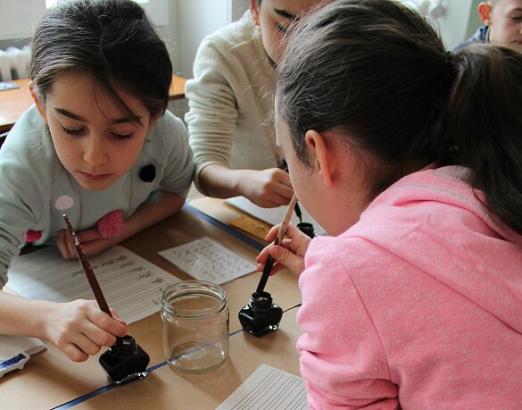 An die Zeitreise mit historischem Unterricht kann man auch ergänzend das Modul „Klecksen verboten“ anschließen. Hier steht die alte Schrift im Mittelpunkt und das Schreiben mit einer Feder.