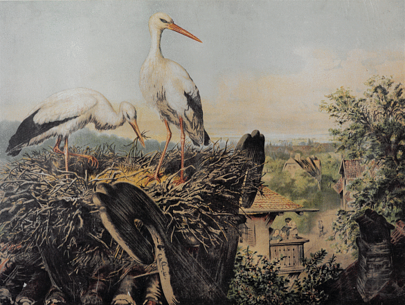 Ein Lehrerhandbuch von 1900 beschreibt zum Bild: "Was können wir nun von unseren lieben Störchen lernen? In jedem Jahre kommen sie wieder zu uns und haben also wohl unser Land recht lieb. – Sie können uns hierin ein Vorbild sein; denn auch wir sollen unser Vaterland, darinnen wir geboren sind und worinnen unsere Eltern wohnen, über alles lieben. Kaum haben sie ihr Nest aufgefunden, so sind sie auch schon fleißig, dabei aber munter und froh. Auch dieses wollen wir den Störchen nachtun".